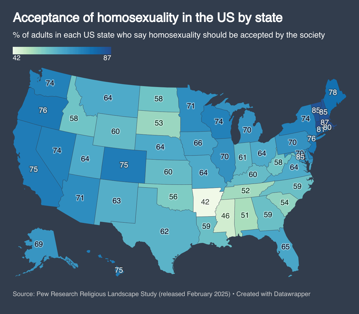 Speaking as a straight cis man, it is baffling to me that so many people aren’t accepting. I think a lot of people look positively at this chart – 48/50 states where the majority are accepting; up to 85-87% accepting in certain states. But that is still a ridiculously large amount of people who aren’t accepting. I wonder what percentage of those who aren’t accepting have cheated on their partner. I wonder how many of those that use religion as their excuse for not accepting have had premarital sex. Its baffling to me that people feel like they have the right to judge what occurs between consenting adults