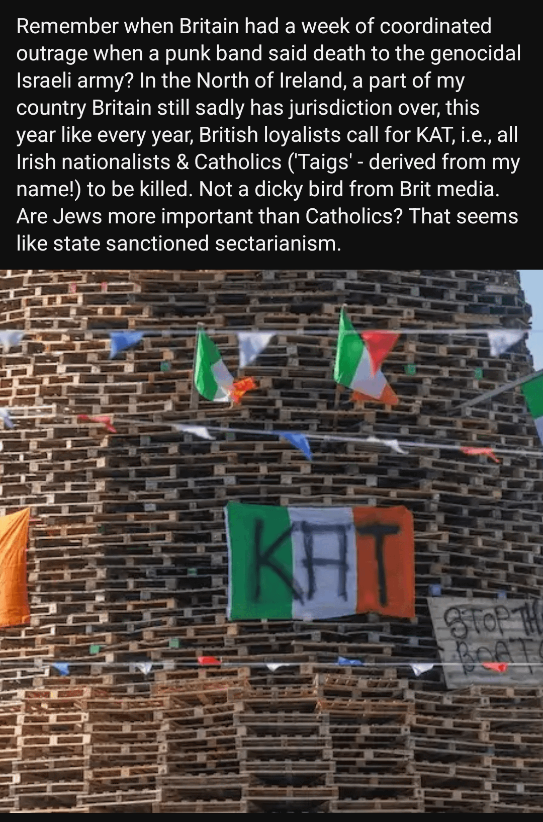 13. I don’t understand (A) how blatant and widespread calls for genocide against Irish Catholics are allowed each and every year and (B) how some Unionism do not see that this only hastened the end of British rule.