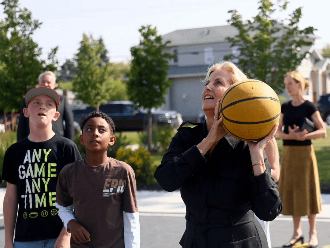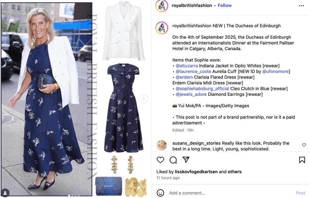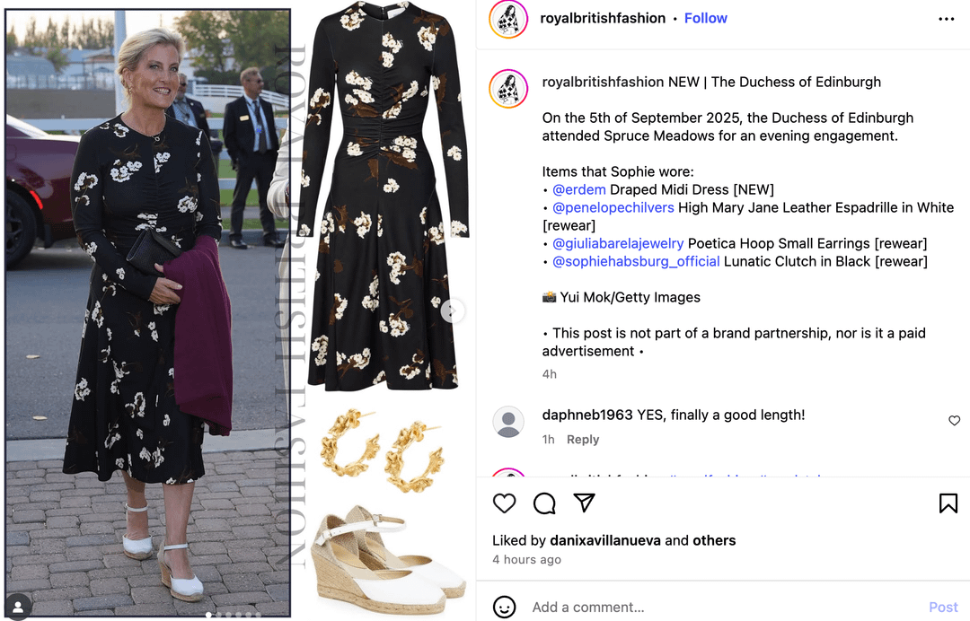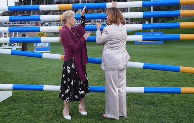 On the evening of September 5, 2025, the Duchess of Edinburgh, accompanied by Linda Southern-Heathcott, attended the Six Bar Challenge show jumping event at Spruce Meadows in Calgary. Spruce Meadows is a multi-purpose sports facility near Calgary. On this occasion, she wore a new draped midi dress by Erdem.