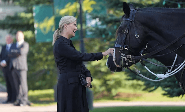 On Friday, September 5, 2025, the Duchess of Edinburgh, accompanied by Linda Southern-Heathcott, President and CEO of Spruce Meadows, visited the multi-purpose sports facility in Calgary. The venue, built by the Southern family and opened in 1975, is a landmark in equestrian sport. On this occasion, the Duchess wore a black button front cotton-silk midi shirtdress by Gabriela Hearst.