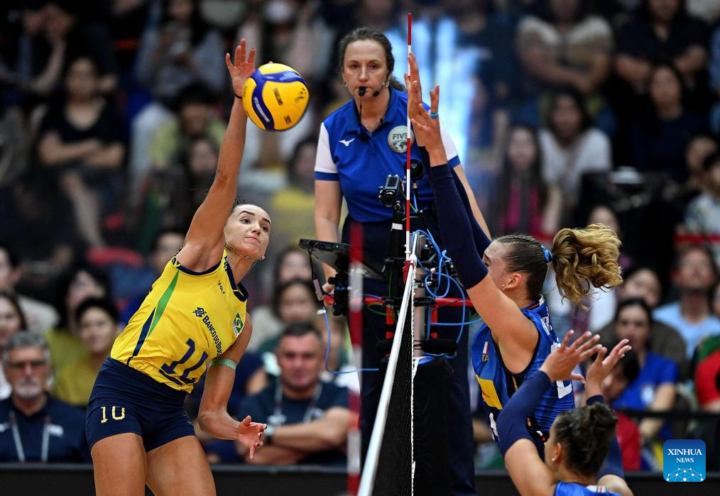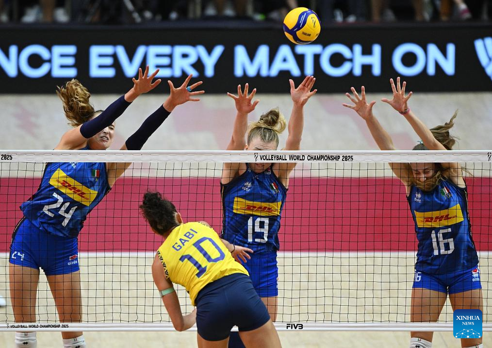 Gabriela Braga Guimaraes (L) of Brazil spikes the ball during the semifinal match between Italy and Brazil at the Volleyball Women’s World Championship in Bangkok, Thailand, Sept. 6, 2025. (Xinhua/Hou Zhaokang)