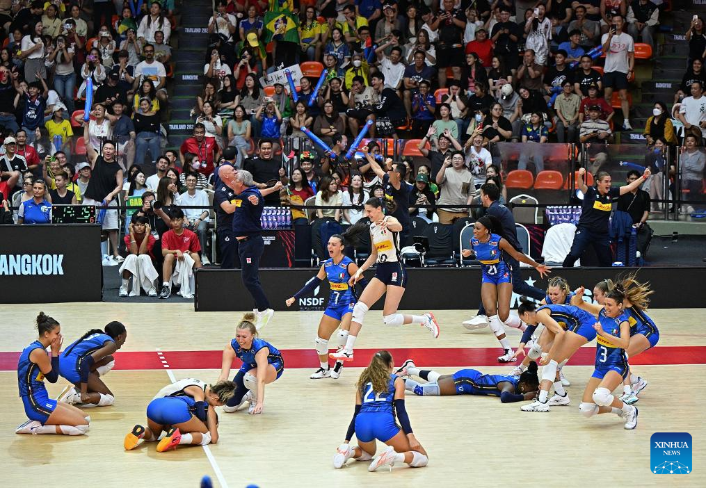 Players of Italy celebrate victory after winning the semifinal match between Italy and Brazil at the Volleyball Women’s World Championship in Bangkok, Thailand, Sept. 6, 2025. (Xinhua/Hou Zhaokang)