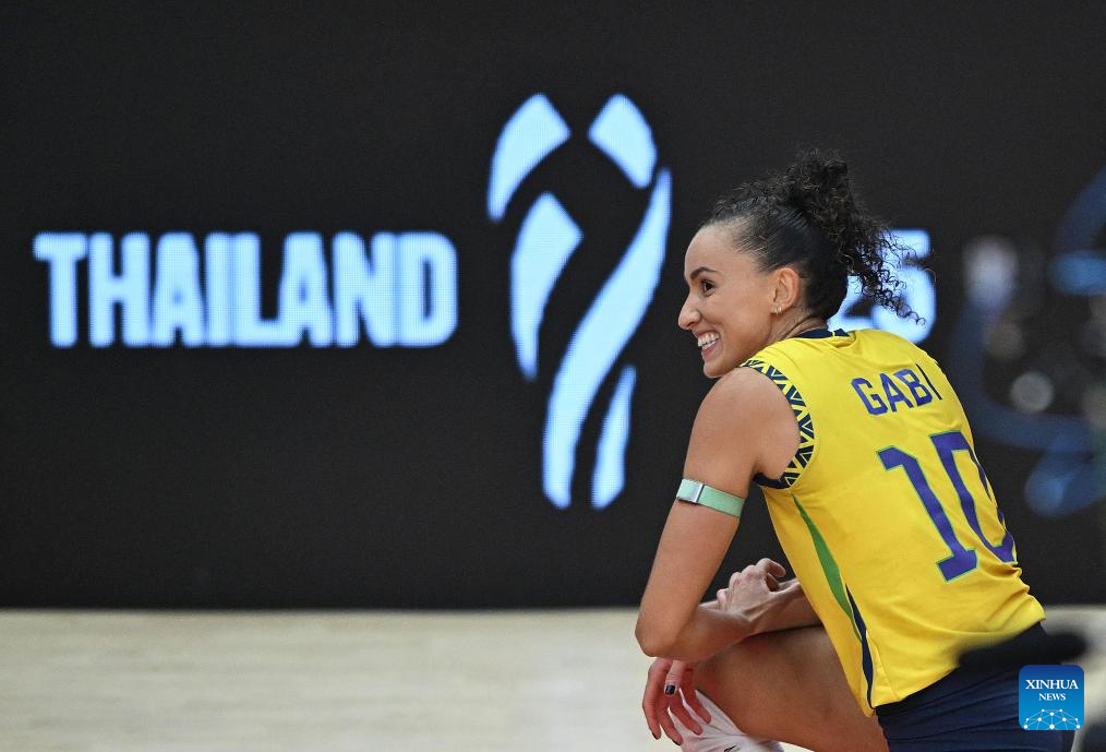 Gabriela Braga Guimaraes of Brazil reacts during the semifinal match between Italy and Brazil at the Volleyball Women’s World Championship in Bangkok, Thailand, Sept. 6, 2025. (Xinhua/Hou Zhaokang)