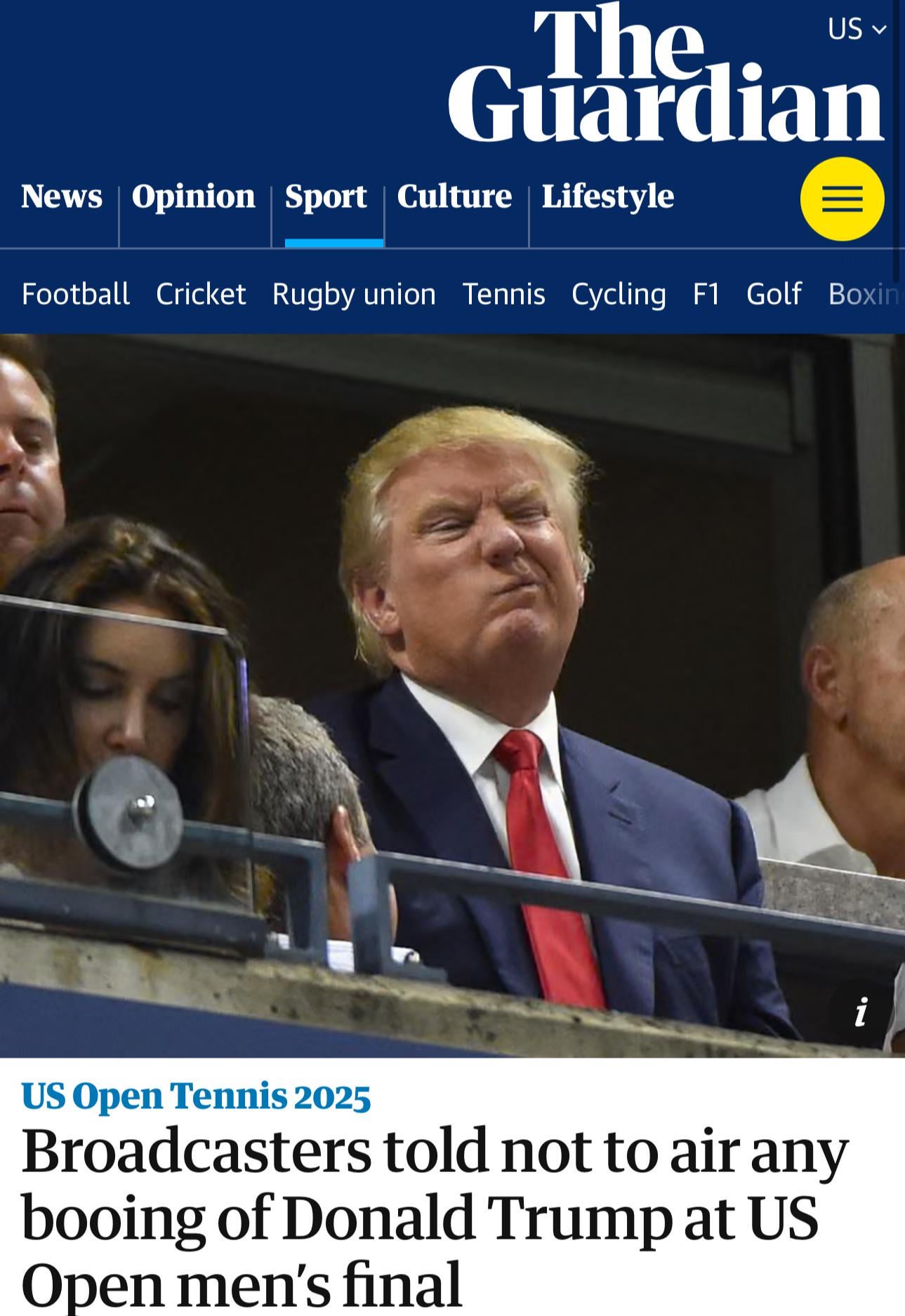 *US Open broadcasters have been asked not to show any negative crowd reactions to Donald Trump at Sunday’s men’s final. … An email sent to broadcasters by organisers reveals that the 79-year-old will be shown on screen during the singing of the national anthem ahead of the match. The message adds: “We ask all broadcasters to refrain from showing any disruptions or reactions in response to the president’s attendance in any capacity.”*