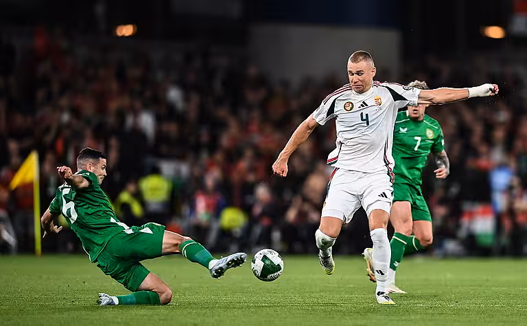 6 September 2025; Attila Szalai of Hungary is tackled by Josh Cullen of Republic of Ireland during the FIFA World Cup 2026 Group F qualifying match between Republic of Ireland and Hungary at the Aviva Stadium in Dublin. Photo by David Fitzgerald/Sportsfile
