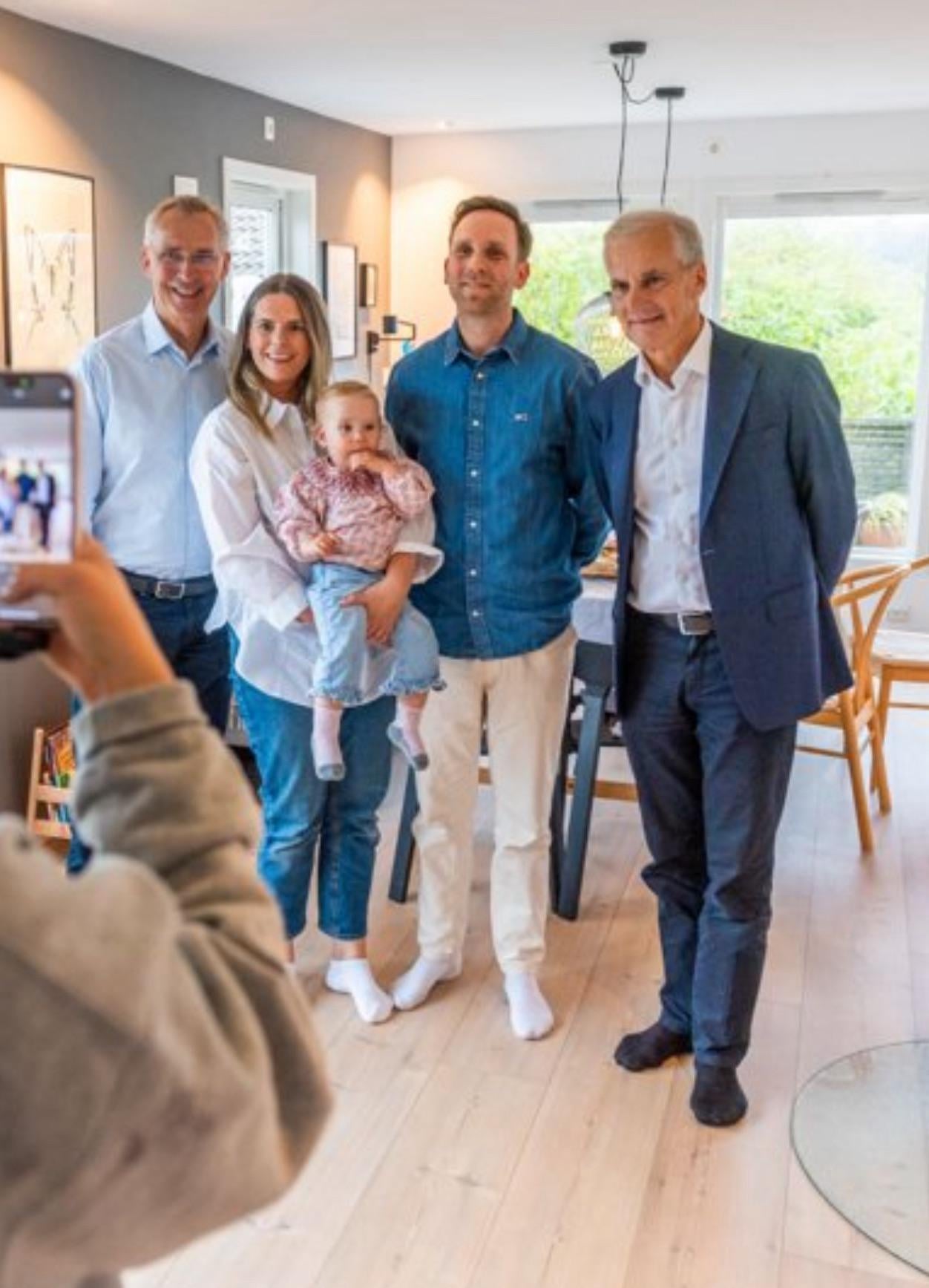 Norwegian Prime Minister and Minister of Finance (former secretary general of NATO) standing just in their socks, visiting some ordinary family in connection with the election campaign before the general election. It is an unspoken rule in Norway and from what I know in the other Nordic countries to take off your shoes when entering a private home. In more formal settings, like a party, you are welcome to bring your own indoor shoes. (Source: Aftenposten)