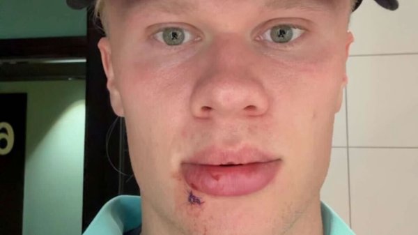 – Ble akkurat slått ut av en bussdør. Tre sting, skrev Erling Braut Haaland til en selfie av seg selv.