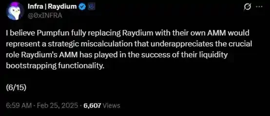 On February 24th, someone on Twitter noticed that pump.fun was testing its own AMM liquidity pool. The next day, Raydium core contributor @0 xINFRA published a lengthy tweet sharply commenting on the matter. The tweet was already quite charged with controversy, essentially emphasizing Raydium’s significant role in pump.fun’s success and that Raydium’s recent data showed it was less reliant on pump.fun. His most pointed remarks were in the following paragraph: