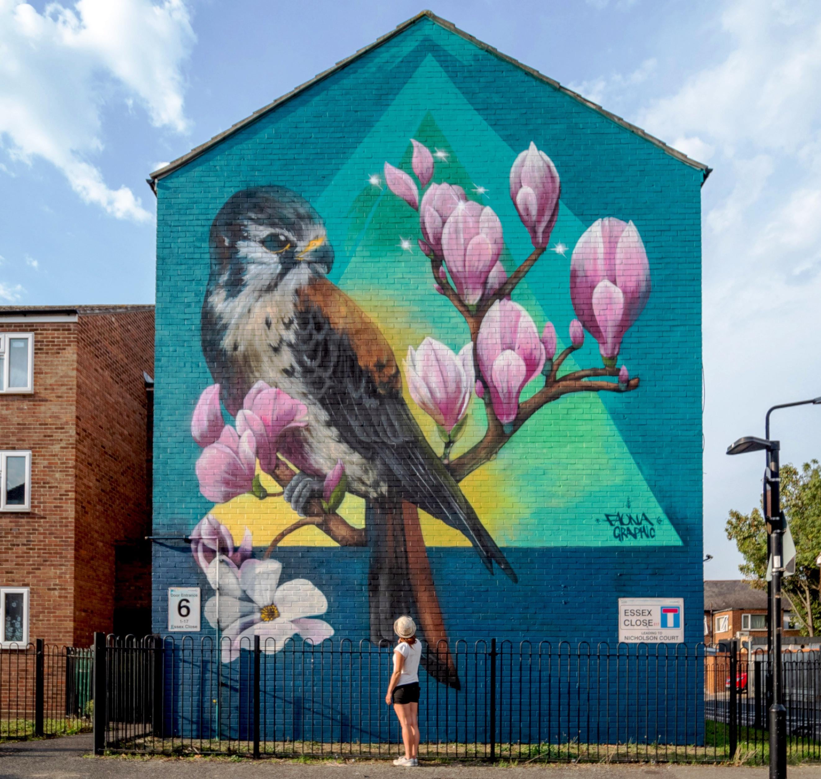 London mural festival – the largest artwork I painted in London, Kestrel & magnolia