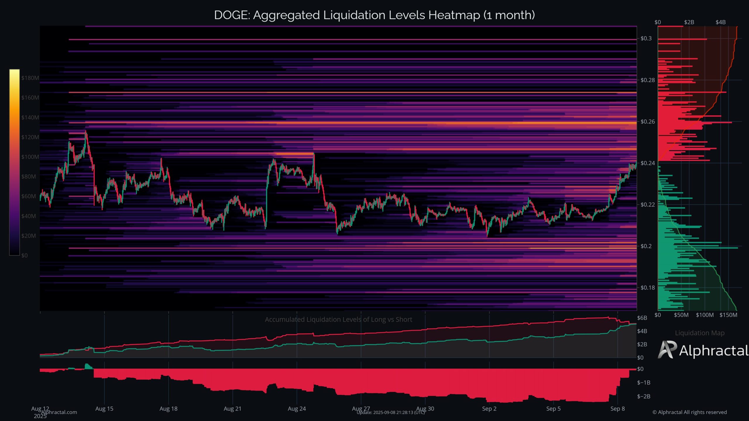 The Liquidation Heatmap backs this up, showing heavy clusters of long and short positions stacked between $0.22 and $0.26. With leverage piled up, even small price moves could trigger liquidations, forcing rapid price spikes in either direction.