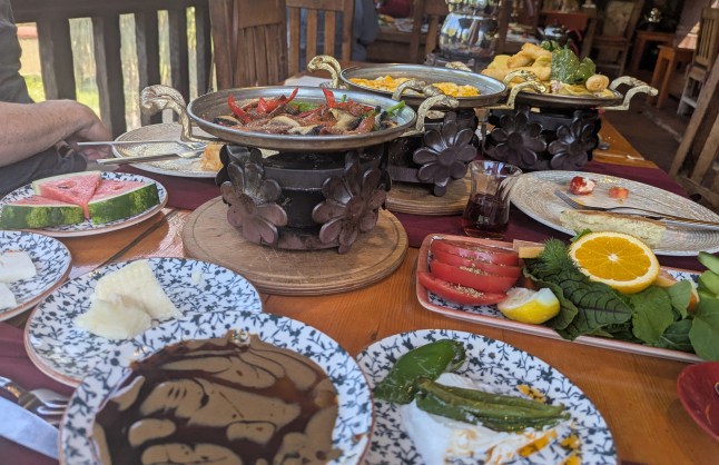 We’re talking a variety of cheese and fresh fruit and veg, alongsideomelettes, börek (filo pastry with savoury filling), meat with mushroom, lokma (like donuts and very popular with my teenage son) as well as unlimited hot flatbread and Turkish tea. It costs 750 Lira per person (around £14) but children under 7 eat free.
