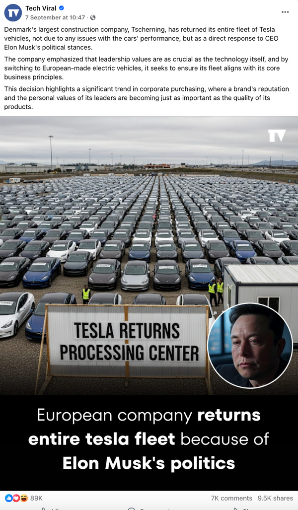 In September 2025, a rumor spread that Denmark’s largest construction company had returned its fleet of Tesla cars, citing the politics of Tesla CEO Elon Musk.
