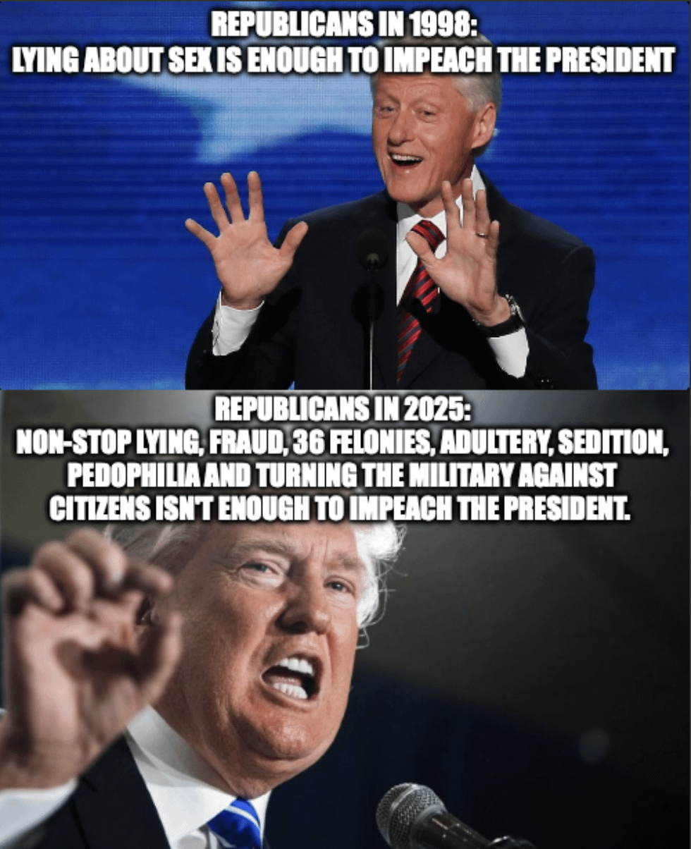 Nothing changed. They never actually cared about Clinton’s blowjobs. Republicans don’t act or argue in good faith. They have been deliberately trying to sabotage the government for over 50 years. Their plan is to convince idiots that government doesn’t work, by breaking it intentionally.