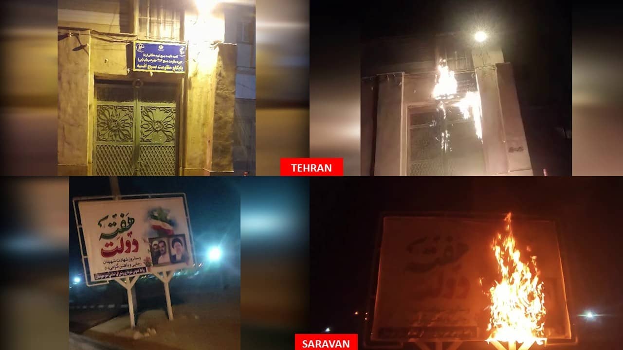 In addition, the signs of the Basij intelligence headquarters of the Revolutionary Guards, along with the symbols, signs, and images of Khamenei, Ebrahim Raisi, and Qassem Soleimani, were set ablaze in the cities of Semirom, Aligudarz, Saravan, Tehran, and Ramhormoz.