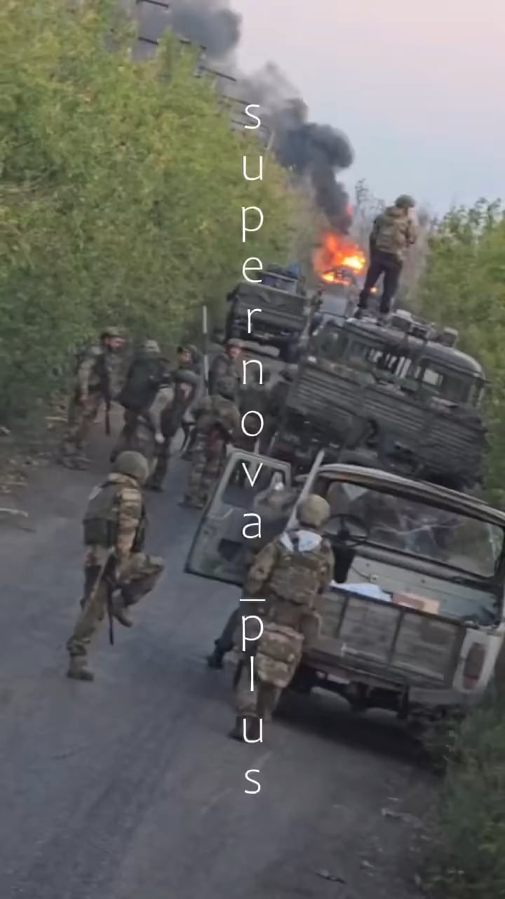 Training working overtime for these Russians. Just standing there watching the lead vehicle burn, while there are undoubtedly more drones on the way. “We are lucky they are so fucking stupid”