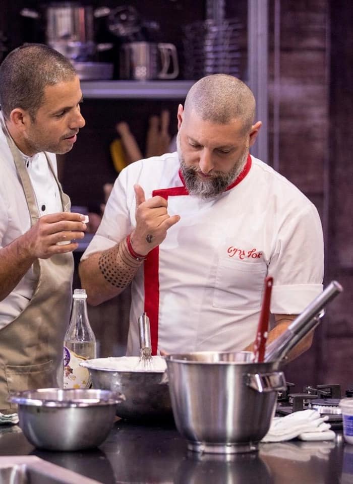 Chef Yaki Sagi appearing on ‘Master Chef’ in 2018 with judge Asaf Granit (Courtesy)