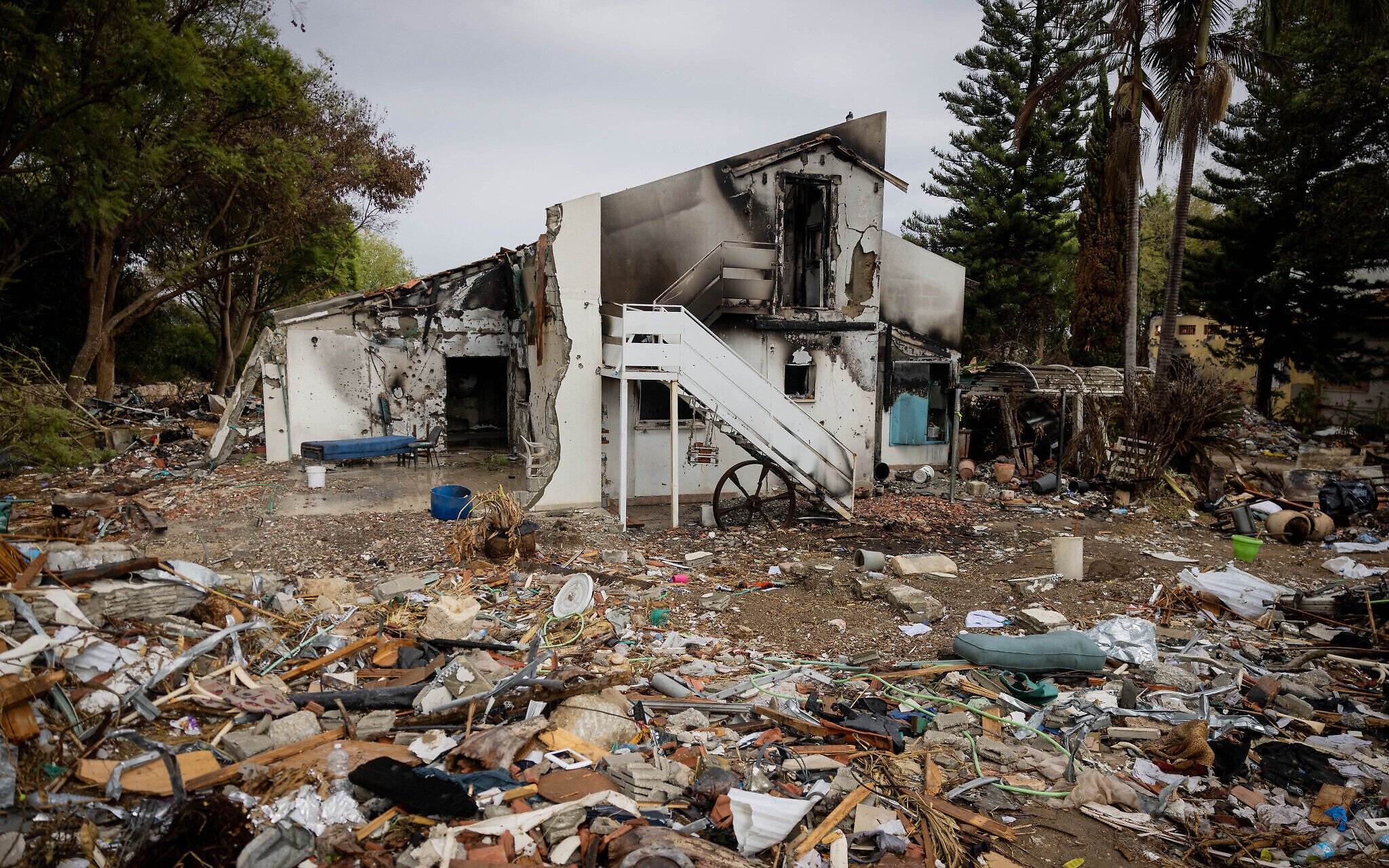 The remains of the home of Pessi Cohen, where Hamas held 14 Israelis hostage on October 7, 2023, in Kibbutz Be’eri, seen on November 19, 2023. (Chaim Goldberg/Flash90)