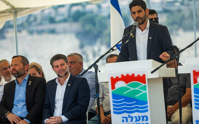 Ma’ale Adumim Mayor Guy Yifrach speaks during a press conference announcing his plans to approve more than 3,000 housing units in the E1 settlement project between Jerusalem and Ma’ale Adumim, August 14, 2025 (Yonatan Sindel/Flash90)