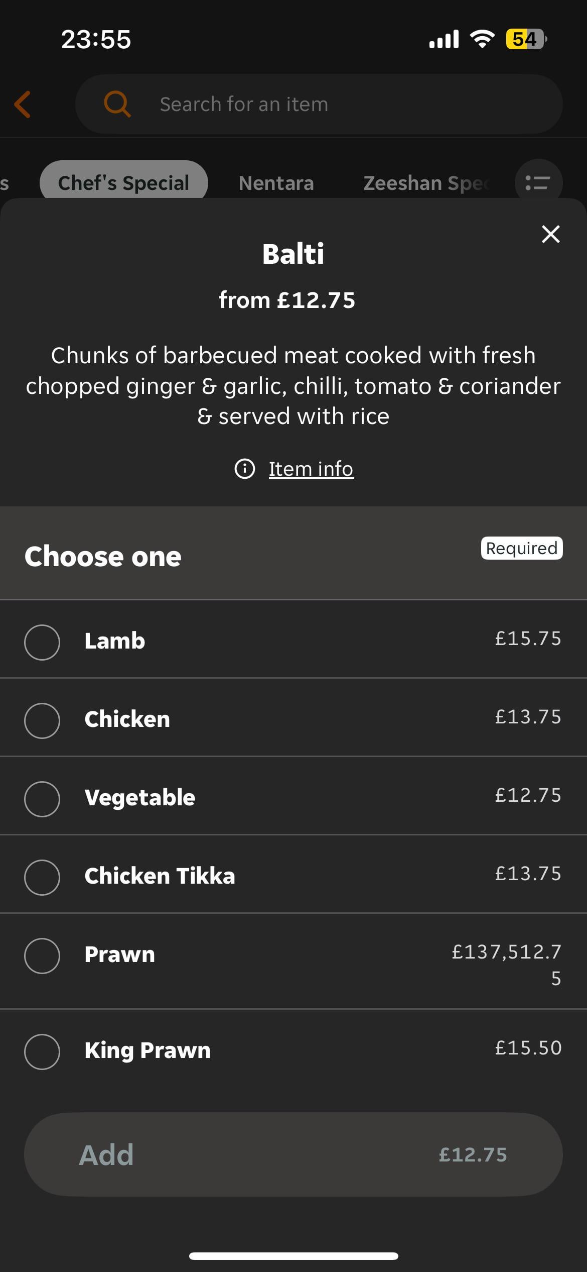 4. Presumably there should’ve been another option (Pork? Does it even go with balti) for £12.75?