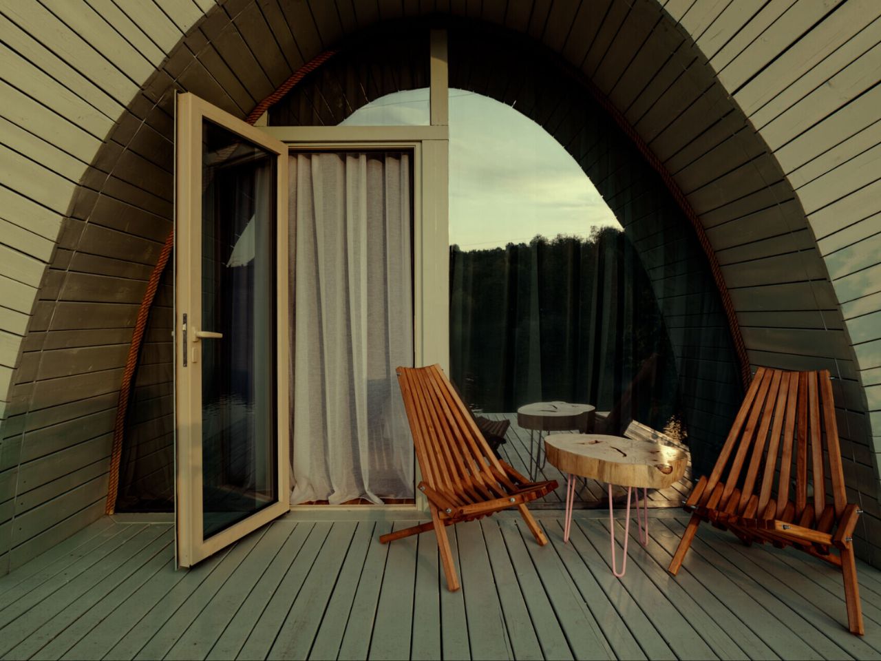 The domed forms suggest protection and shelter, while panoramic glazing opens each interior to sweeping lake views. This duality, introverted earth form paired with outward-facing transparency, gives the cabins a spatial character that feels both safe and expansive. Its architecture seems to breathe with its surroundings, restoring rather than disrupting the natural rhythm of the site.
