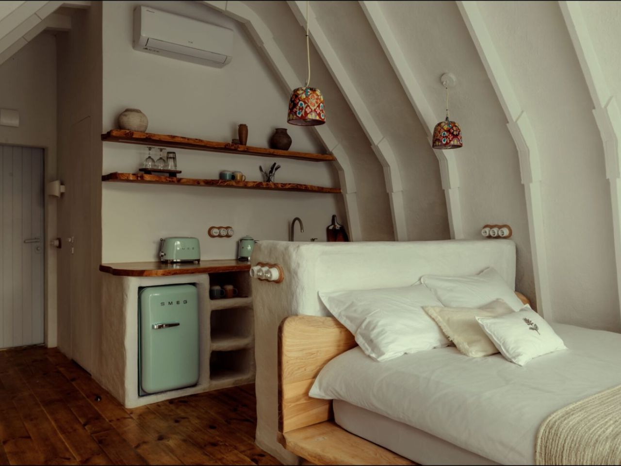 The construction recalls rural Moldova’s heritage. Walls are packed with straw bales, finished in clay-and-straw plaster, and sealed with lime wash, a palette of humble, natural materials once common across the countryside. These choices do more than pay homage to tradition; they actively shape the performance of the houses. The natural walls create a self-regulating microclimate, keeping interiors cool in summer and warm in winter, while maintaining balanced humidity levels year-round.