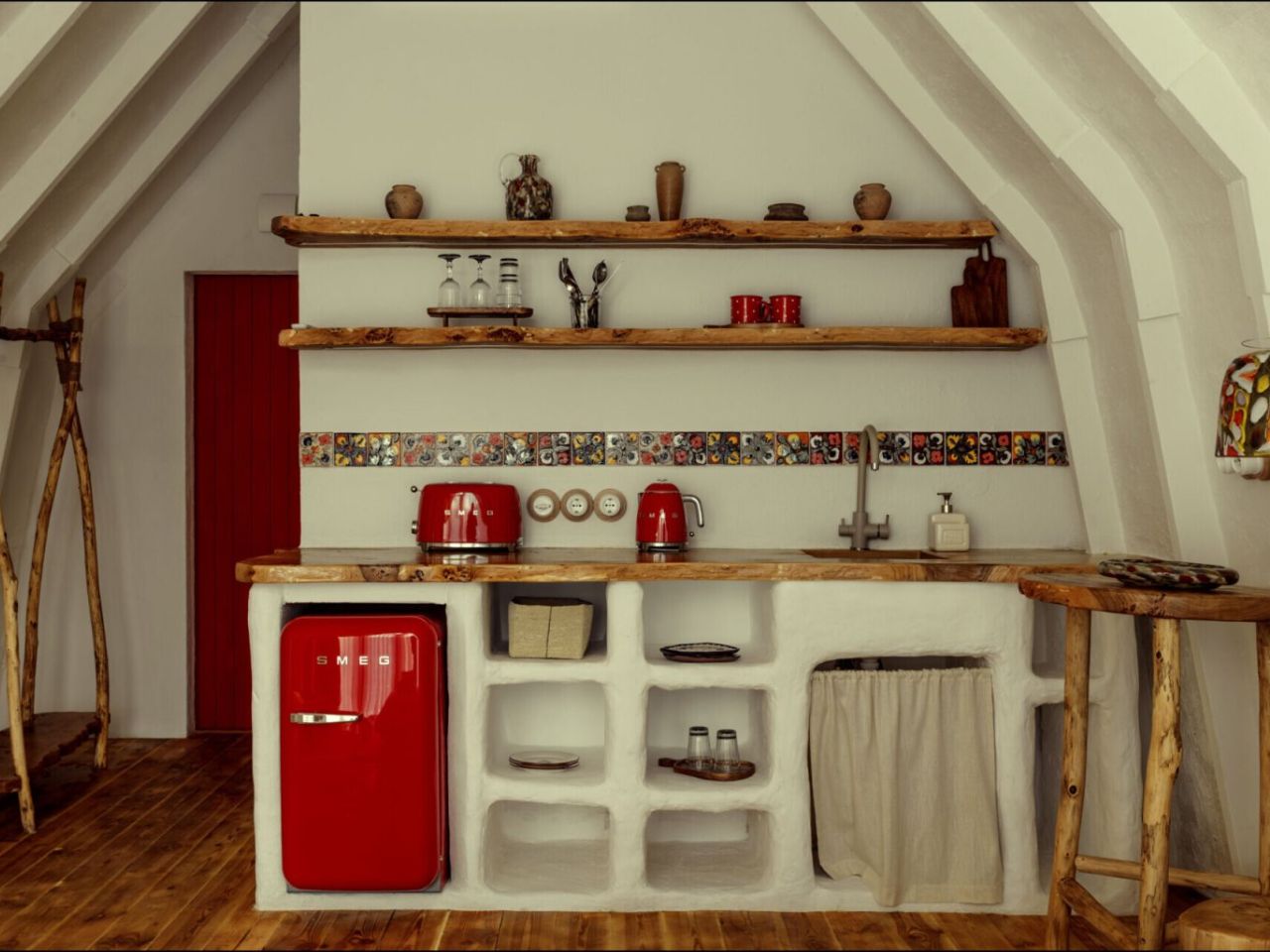 The kitchens embody this philosophy of individuality. Rather than replicating a standard model, Lemnaria designed distinct versions for each cabin, altering shelves, cabinets, and fittings to give every space its own personality. Playful tiles and appliances, coordinated to match the color of each door, add moments of surprise and delight. It’s vernacular improvisation reimagined for modern living.
