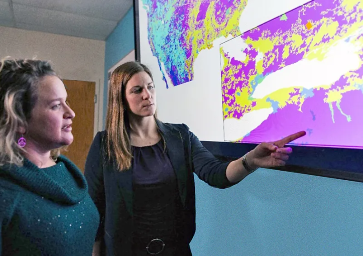 Carrie Manore, left, and Morgan Gorris are part of a team that developed one of the winning technologies, EpiEarth, a unique tool that partitions geographic space into regions with shared properties for input into disease, disease carriers (such as mosquitoes or ticks) and human models to predict disease spread. Photo Courtesy LANL