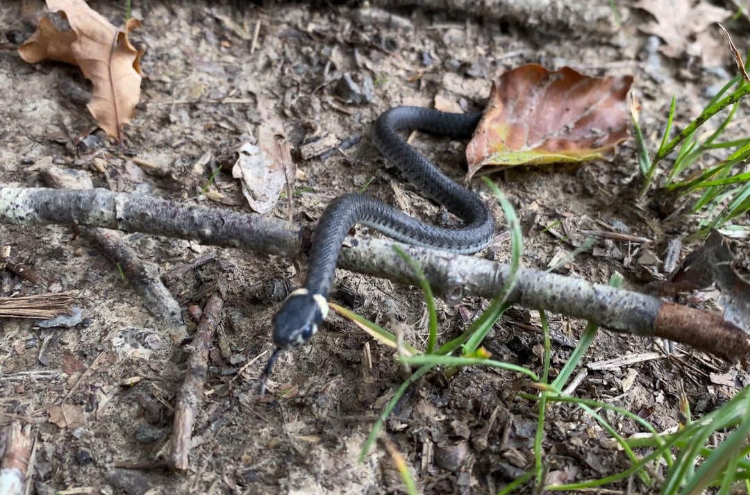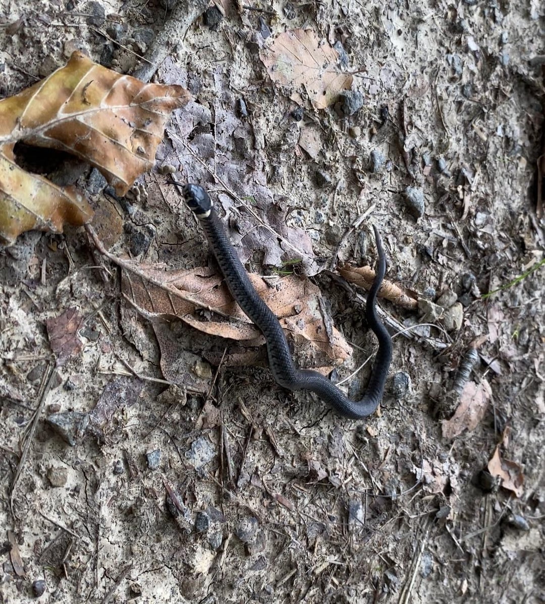 Ringelnatter. Erkennbar an den beiden Halbmonden am Kopf. Harmlos, allerdings sondern die bei Bedrohung ein übelriechendes Sekret ab.