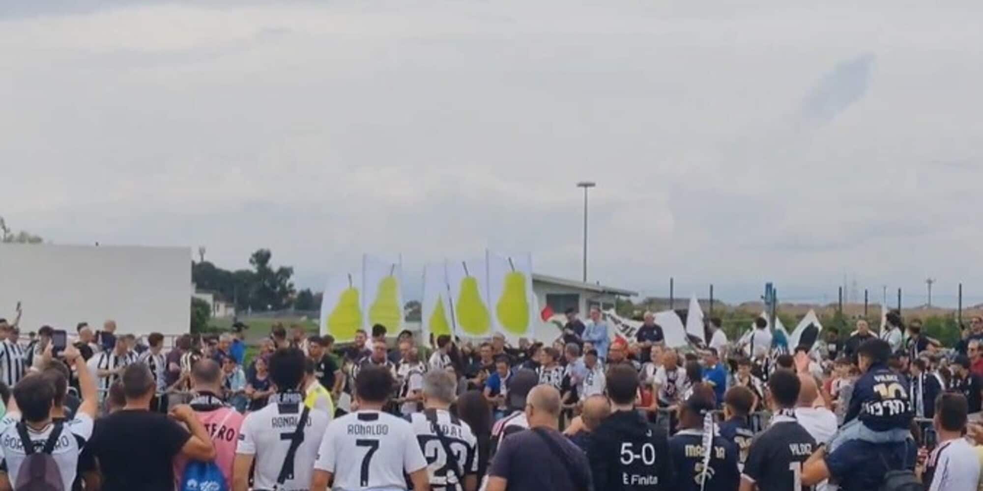 Alcuni tifosi bianconeri si sono presentati all’esterno dell’Allianz Stadium con 5 cartelli, ognuno dei quali ritrae… una pera. Il riferimento ironico è ovviamente al ko dell’Inter per 5-0 nell’ultima finale di Champions contro il Psg