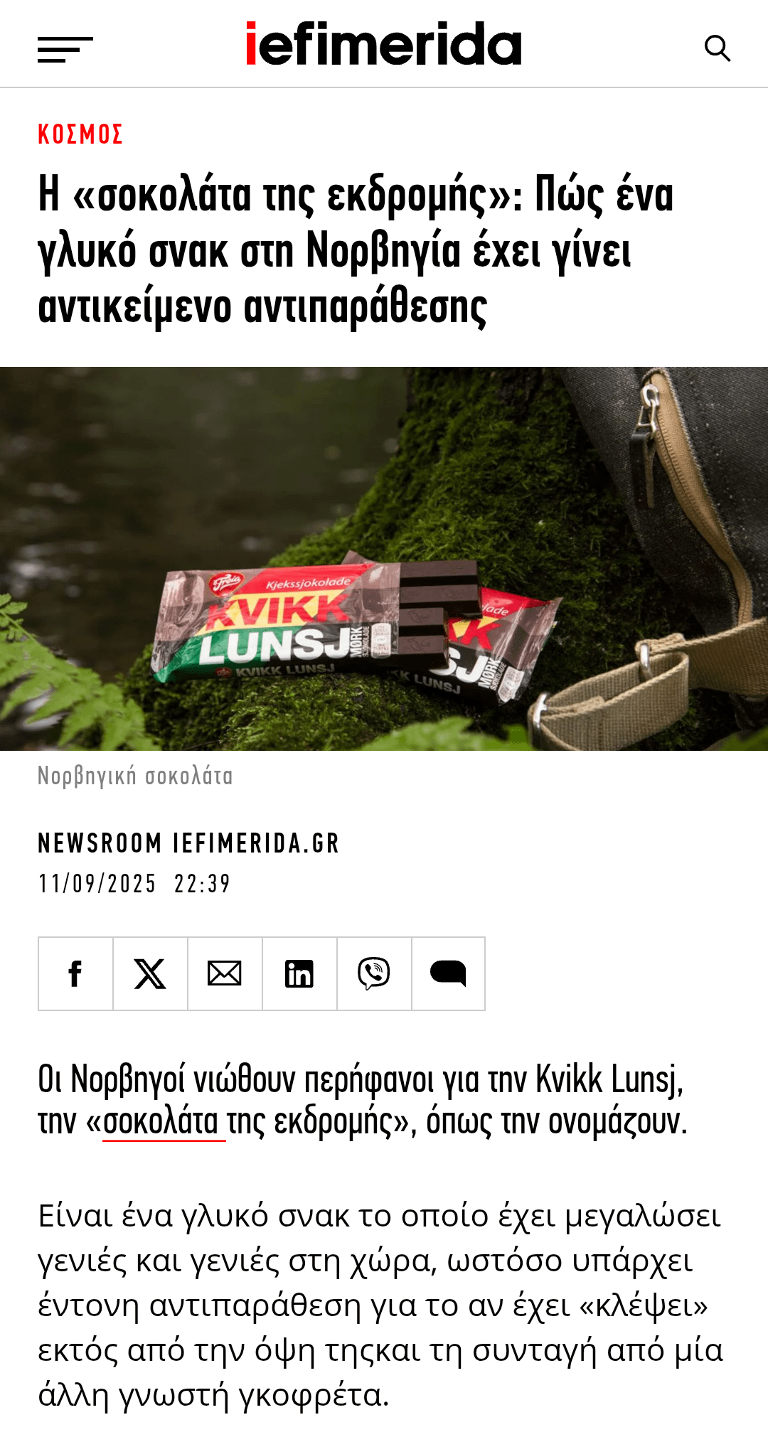 Η «σοκολάτα της εκδρομής»: Πώς ένα γλυκό σνακ στη Νορβηγία έχει γίνει αντικείμενο αντιπαράθεσης – iefimerida.gr https://www.iefimerida.gr/kosmos/i-sokolata-tis-ekdromis-glyko-sti-norbigia-antiparathesi «Utfluktssjokoladen»: Hvordan en søt snacks i Norge har blitt kontroversiell