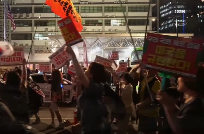 At the heart of the demonstrations was Candlelight Action, the progressive civic coalition that emerged from past anti-government movements. “The United States is even threatening Korea as though we were the wrongdoer,” said Kim Ji-sun, one of its co-leaders, her voice rising over loudspeakers. “Summoning the ambassador is not enough. We must consider expulsion.”