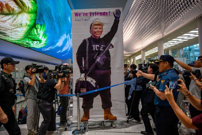 On September 12, at the arrival hall of Terminal 2 at Incheon International Airport, where South Korean workers detained in Georgia by U.S. immigration authorities returned home, Lee Je-seok, head of the Lee Je-seok Advertising Research Institute and widely known as a genius ad planner in Korea, staged a placard performance featuring the image of U.S. President Donald Trump. A recent poll shows that many South Koreans feel not only bewildered but increasingly angry over the incident. (Yonhap)