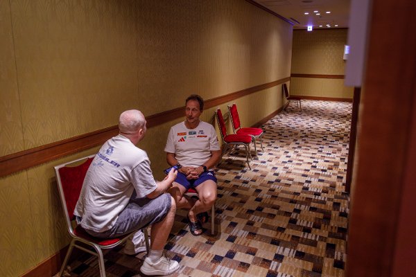GLEDER SEG: Erlend Slokvik under et pressetreff på utøverhotellet i Tokyo.