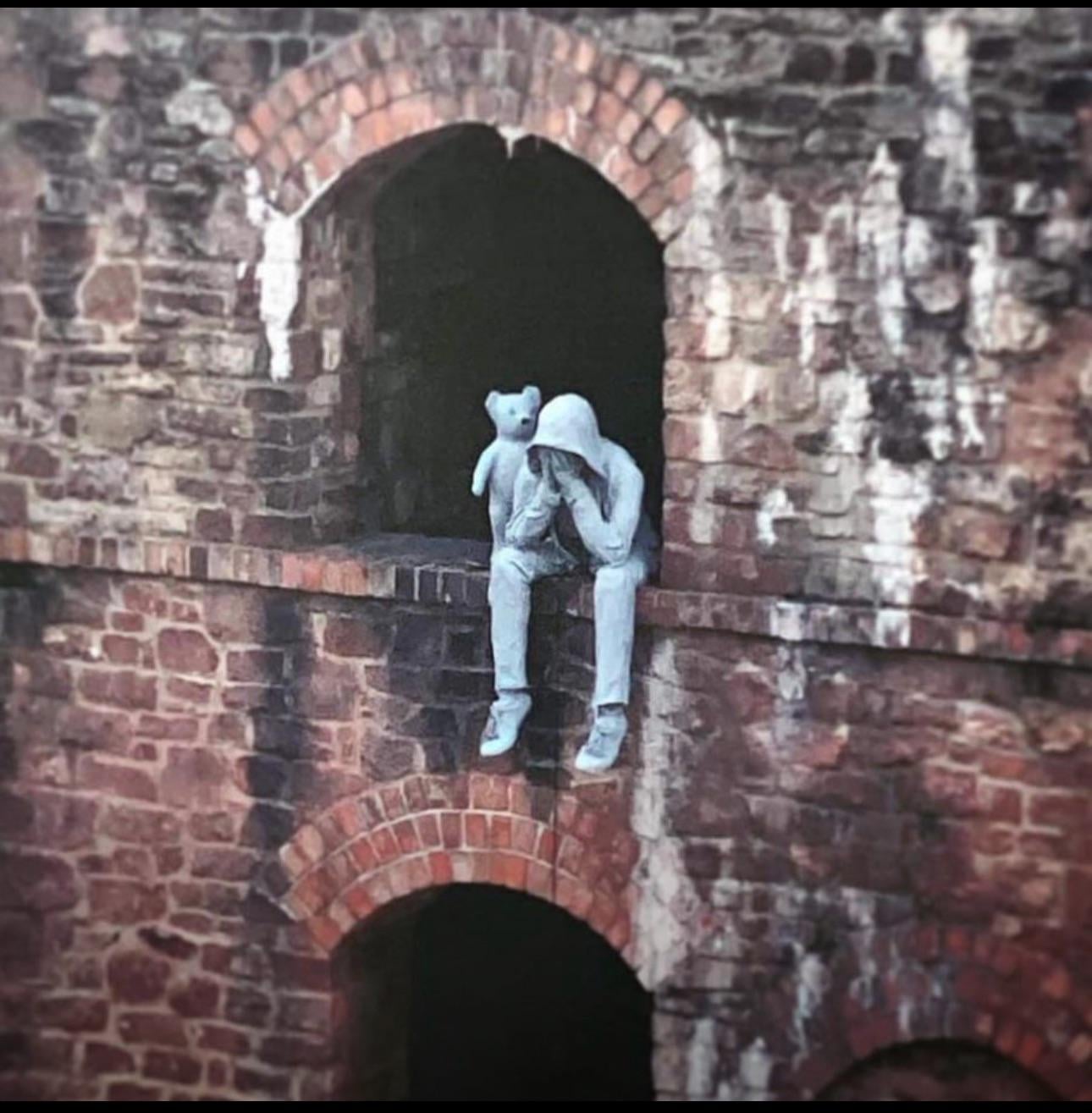 This sculpture appeared overnight in Bristol for World Suicide Prevention Day , a hooded figure, head in hands, with a teddy bear quietly offering comfort.