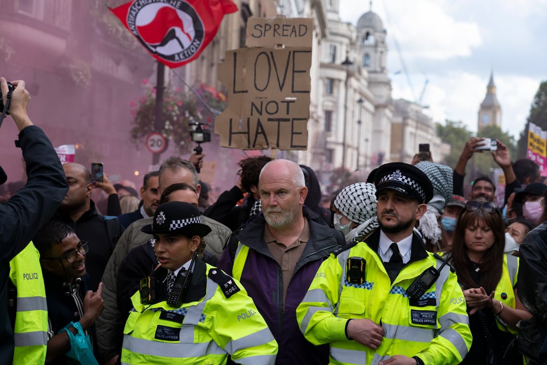 The guy under the spread love not hate sign looks to have a righteous fury in his eyes.