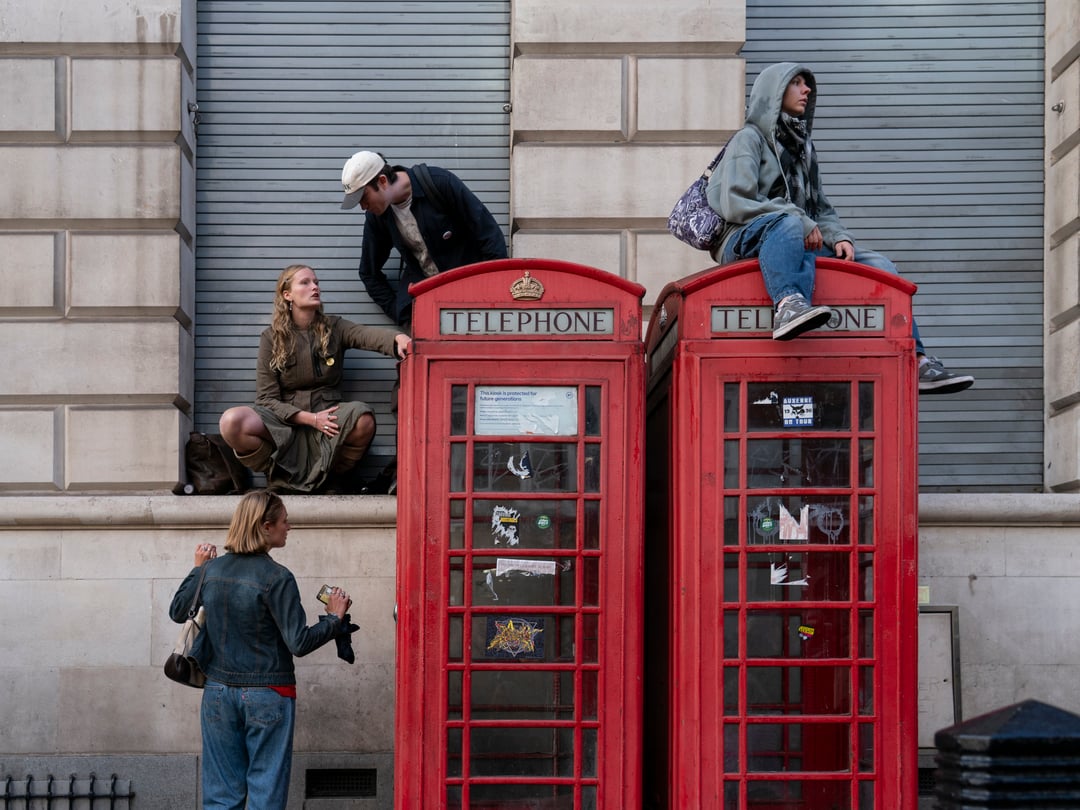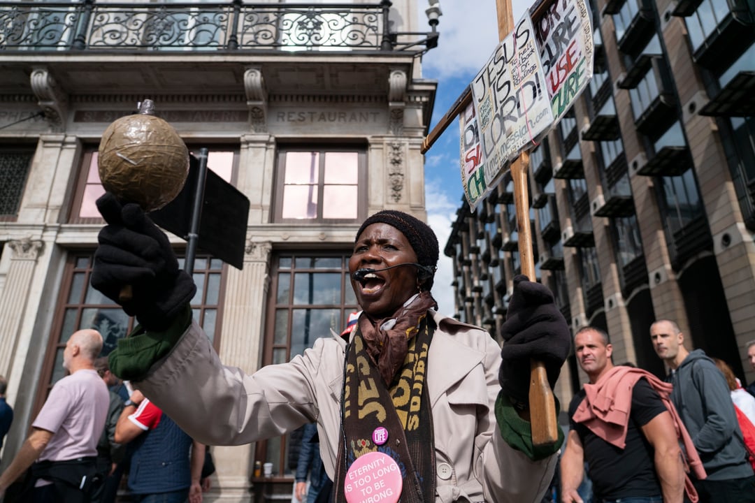 The lady with the Jesus sign and headset isnt a protestor. Shes on Oxford Street every day trying to save folks.