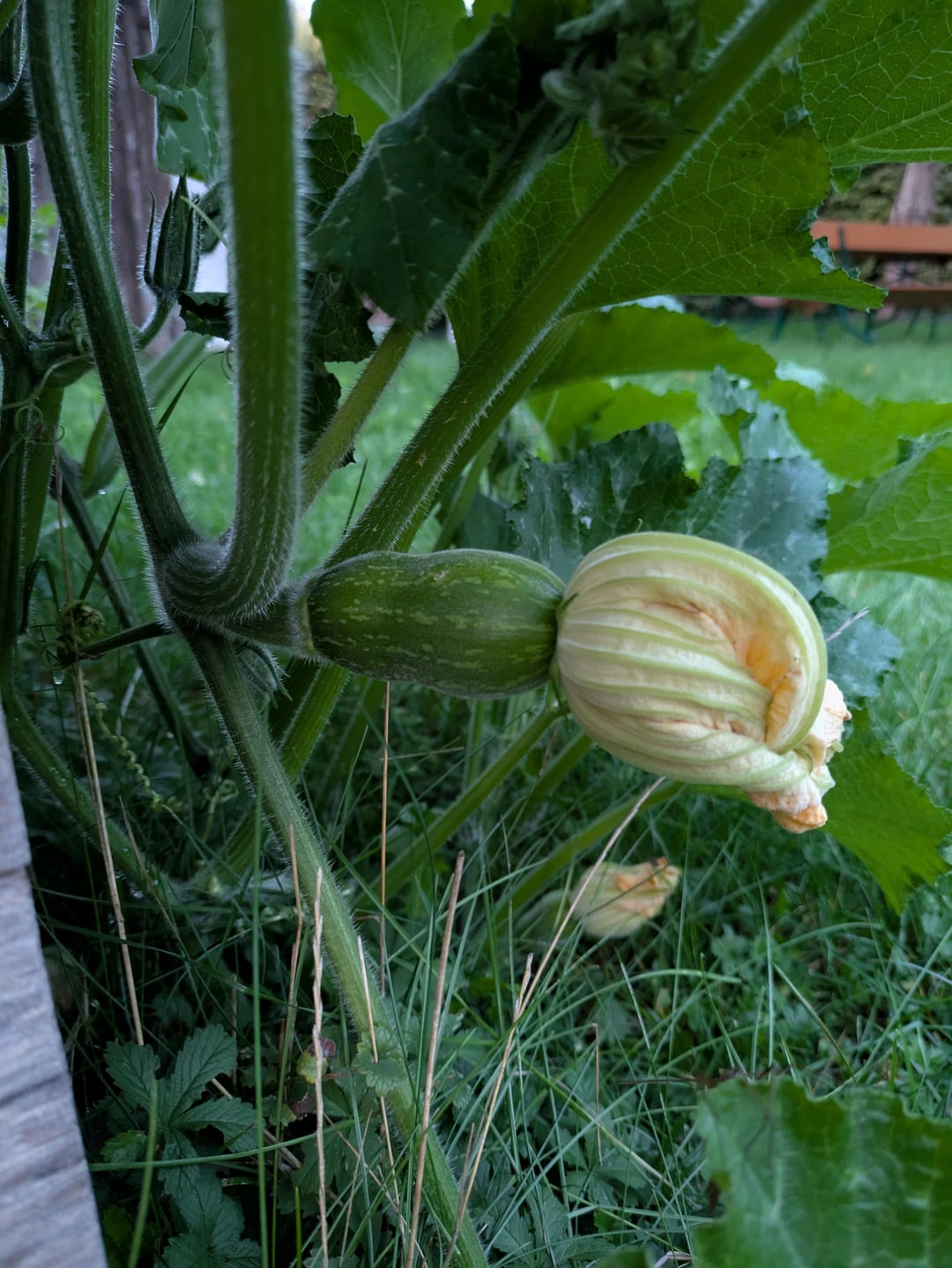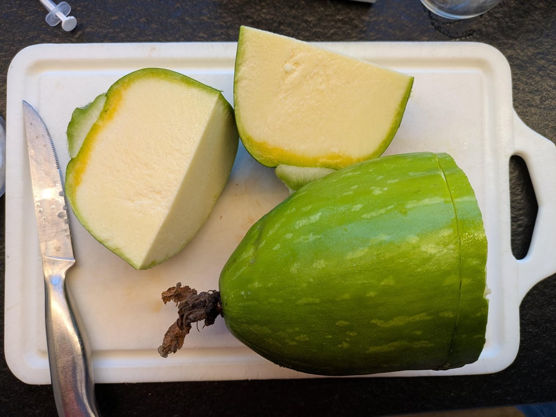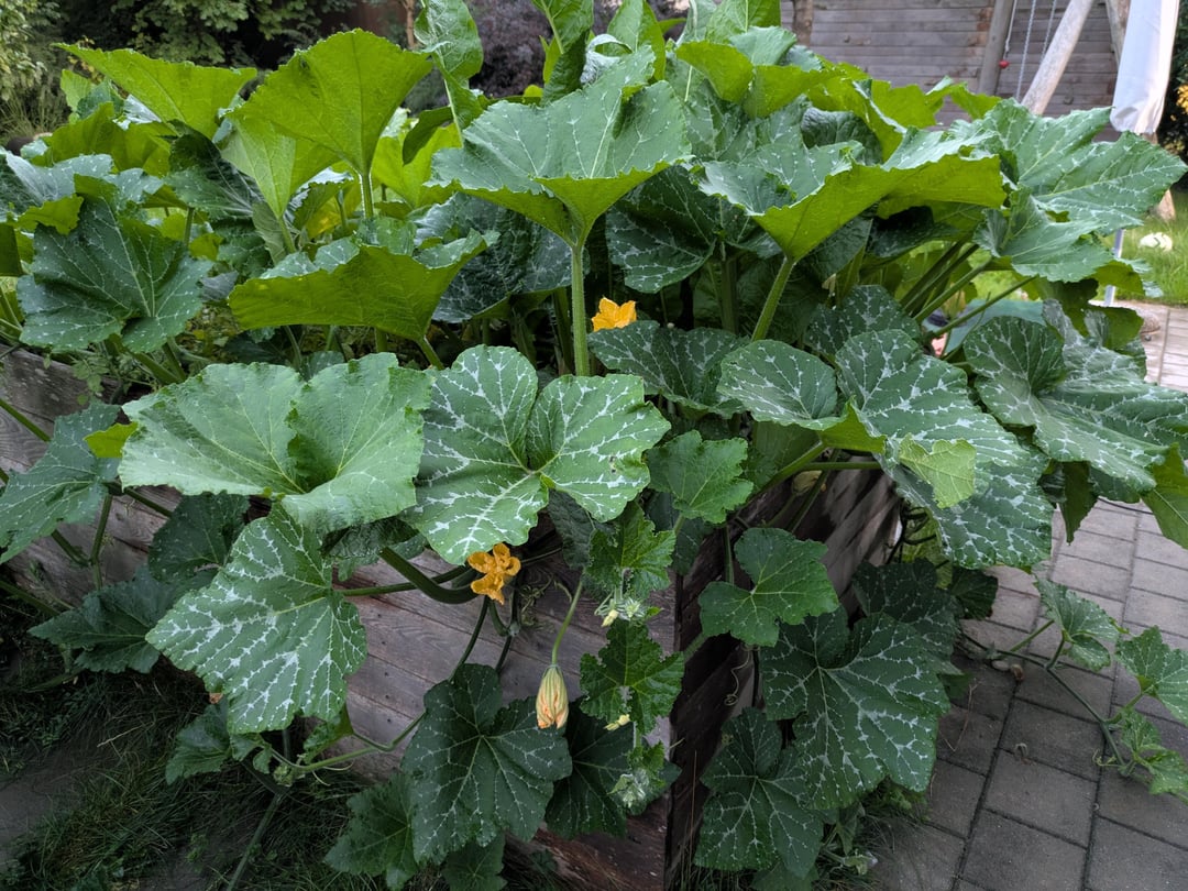Wuchs ist ziemlich gut, hat unser Hochbeet ziemlich überwuchert. Die Blüten sehen nach Zucchini, Kürbis aus. Die Früchte geben uns aber ein Rätsel auf. Keine Kerne, glatte Oberfläche, Geruch eher nach Zucchini.