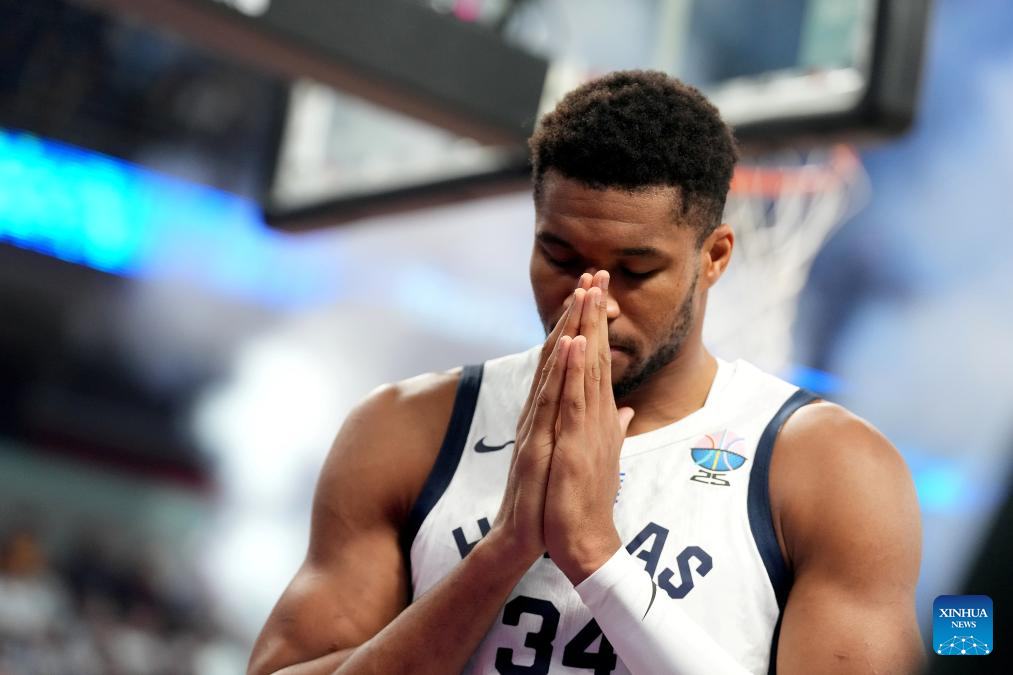 Giannis Antetokounmpo of Greece reacts during the FIBA EuroBasket 2025 3rd place match between Greece and Finland in Riga, Latvia, on Sept. 14, 2025. (Photo by Edijs Palens/Xinhua)