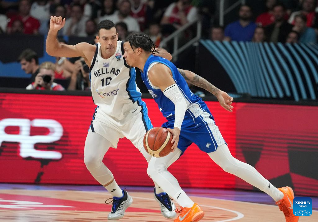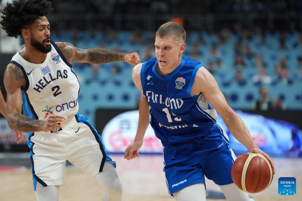 Tyler Dorsey (L) of Greece vies with Elias Valtonen of Finland during the FIBA EuroBasket 2025 3rd place match between Greece and Finland in Riga, Latvia, on Sept. 14, 2025. (Photo by Edijs Palens/Xinhua)