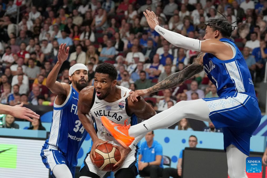 Giannis Antetokounmpo (C) of Greece breaks through during the FIBA EuroBasket 2025 3rd place match between Greece and Finland in Riga, Latvia, on Sept. 14, 2025. (Photo by Edijs Palens/Xinhua)