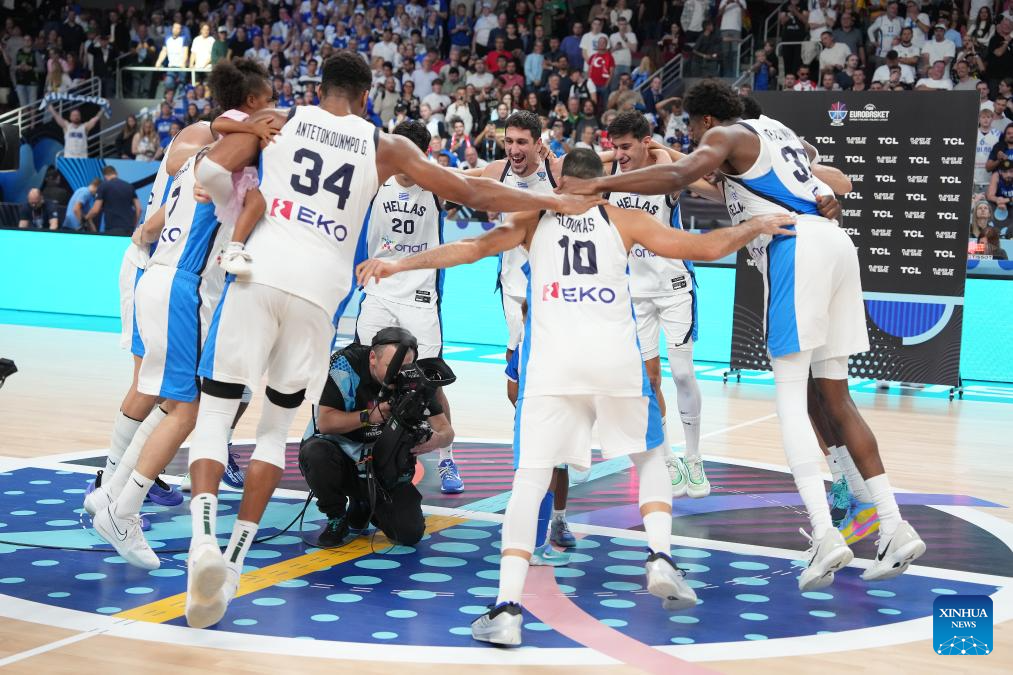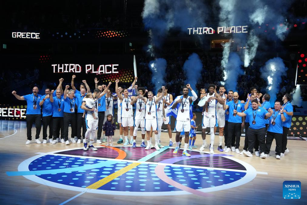 Team Greece celebrate winning the FIBA EuroBasket 2025 3rd place match between Greece and Finland in Riga, Latvia, on Sept. 14, 2025. (Photo by Edijs Palens/Xinhua)