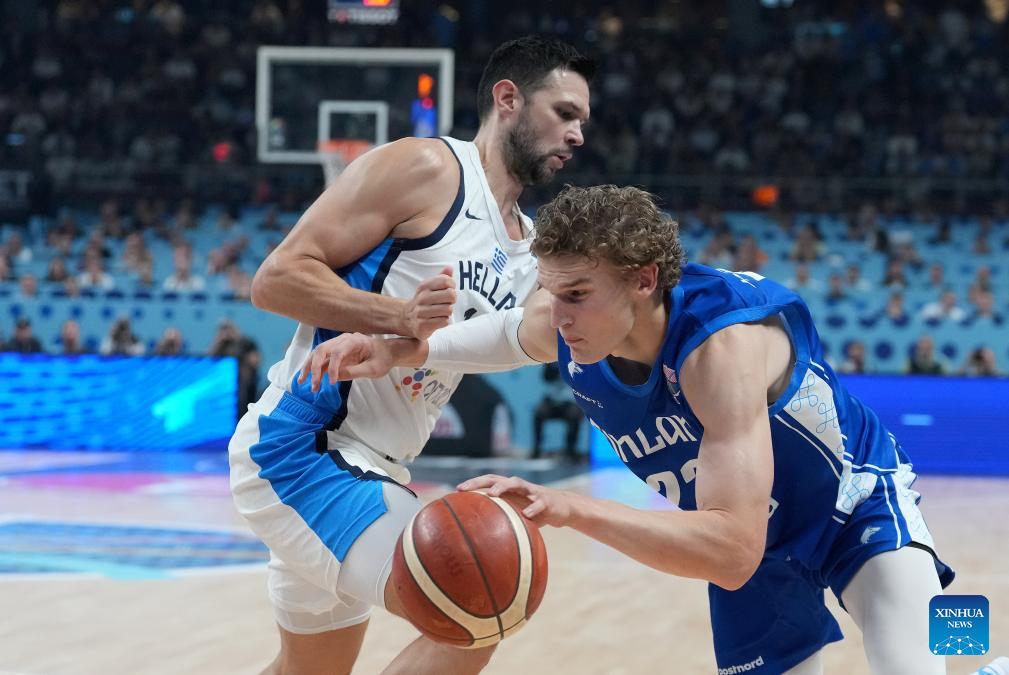 Kostas Sloukas (L) of Greece vies with Miro Little of Finland during the FIBA EuroBasket 2025 3rd place match between Greece and Finland in Riga, Latvia, on Sept. 14, 2025. (Photo by Edijs Palens/Xinhua)