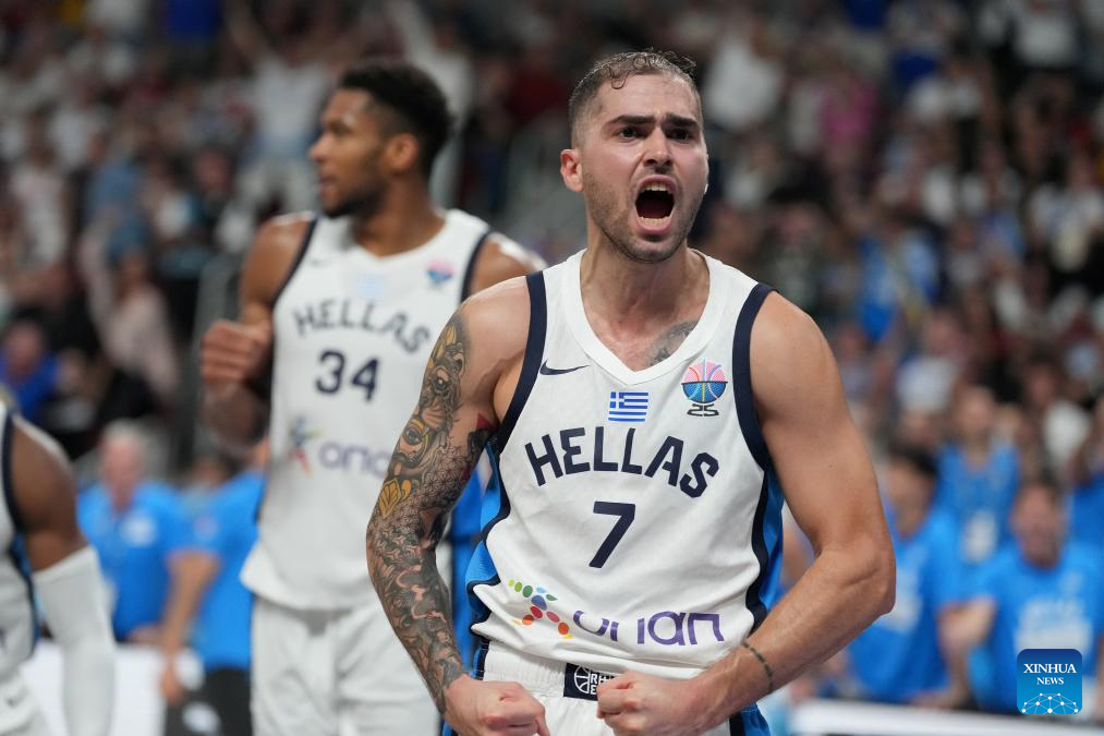 Vasileios Toliopoulos (front) of Greece reacts during the FIBA EuroBasket 2025 3rd place match between Greece and Finland in Riga, Latvia, on Sept. 14, 2025. (Photo by Edijs Palens/Xinhua)