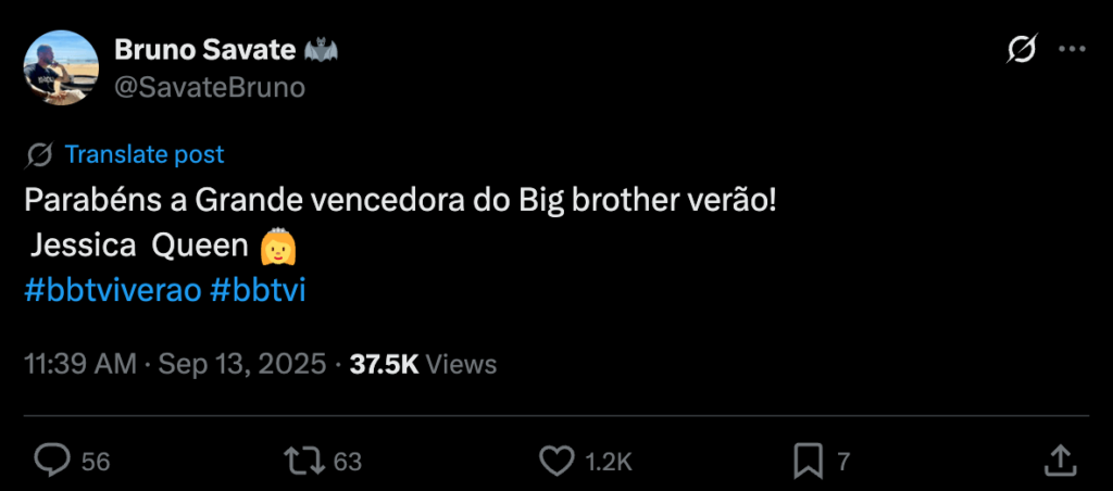 Bruno Savate, veterano dos reality shows, já reagiu à vitória de Jéssica Vieira e deixou-lhe uma mensagem especial, na rede social X. Recorde-se que Bruno Savate manteve-se mais discreto nesta edição, mas ainda assim, não escondeu que gostava do jogo de Jéssica e de Viriato Quintela.