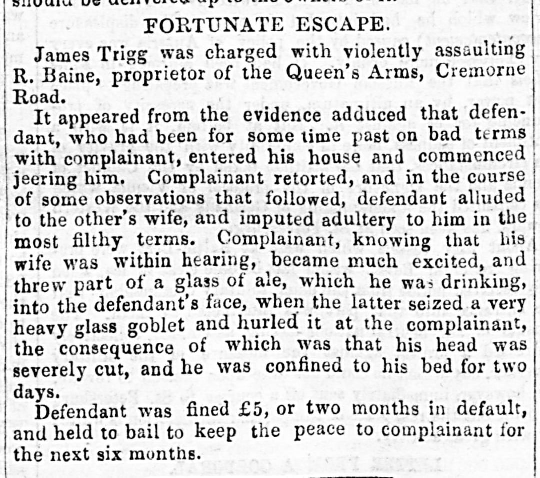 The first time I was able to find the Queen’s Arms in print is 1854 (image 7), in a lively court report. A landlord named R. Baine, “proprietor of the Queen’s Arms, Cremorne Road,” was assaulted after an argument with a customer. That scrap captures the rough-and-ready tone of Chelsea’s riverfront, boatmen, labourers, visitors to Cremorne Gardens spilling in for a pint and it proves the pub was open by the mid-1850s. As it doesn’t appear in the 1851 census, its birth probably belongs to the early 1850s, a child of the Beerhouse Act of 1830.