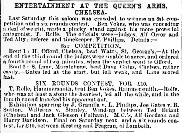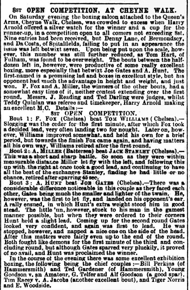 By the 1880s the Queen’s Arms was thriving. Trade directories list it as a “beer and wine retailer,” but interestingly the pub boasted a boxing saloon. Sporting Life in 1889 described “open competitions” (image 8 & 9) and six-round contests for a silver watch or a £10 purse, with local lads like Ben Vokes and T. Rolfe trading punches while referees and timekeepers kept order. Picture a smoky bar beside the Thames, the back room cleared for an eight-stone tournament, working class punters pressed tight around the ropes.