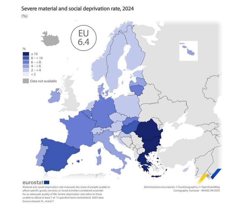 Σε επίπεδο κρατών-μελών, τα υψηλότερα ποσοστά σοβαρής υλικής και κοινωνικής στέρησης καταγράφηκαν στη Ρουμανία (17,2%), στη Βουλγαρία (16,6%) και στην Ελλάδα (14,0%). Αντίθετα, τα χαμηλότερα ποσοστά σημειώθηκαν στη Σλοβενία (1,8%), την Κροατία (2,0%) και την Πολωνία (2,3%).