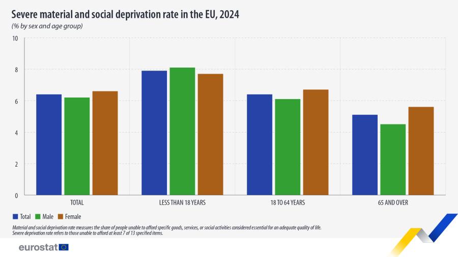 Σύμφωνα με την έκθεση για τις συνθήκες διαβίωσης στην Ευρώπη το 2024, το 6,4% του πληθυσμού της ΕΕ —περίπου 27,5 εκατομμύρια πολίτες— βρέθηκαν σε κατάσταση σοβαρής υλικής και κοινωνικής στέρησης. Το ποσοστό αυτό είναι ελαφρώς μειωμένο σε σχέση με το 6,8% του 2023. Οι νέοι κάτω των 18 ετών πλήττονται περισσότερο (7,9%), ενώ ακολουθούν οι πολίτες ηλικίας 18-64 (6,4%) και οι άνω των 65 (5,1%). Παράλληλα, οι γυναίκες εμφανίζουν υψηλότερα ποσοστά από τους άνδρες (6,6% έναντι 6,2%), με την τάση αυτή να ισχύει σε όλες τις ηλικιακές ομάδες, εκτός από τα παιδιά κάτω των 18 ετών.