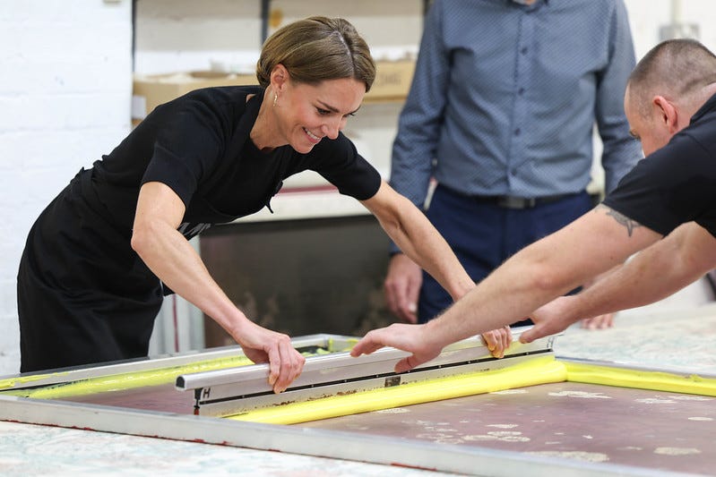 This video of Kate quickly tying her long hair into a bun without using a band or other accessory went viral. It proves a few things: The speed at which she accomplishes this feat shows she’s done this more than a few times; and I and others with straight silky hair can only envy the princess’s thicker curlier locks, as such a bun would come undone within seconds had I attempted it in the long-hair phase of my youth.