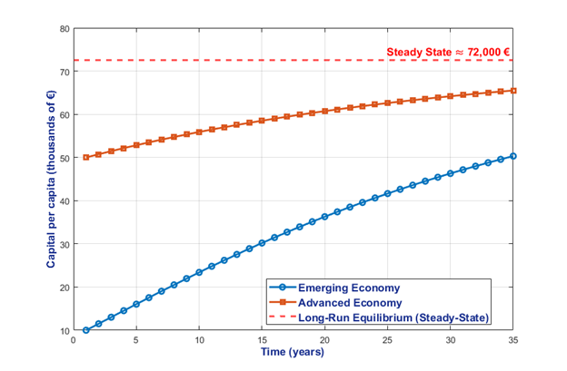 From the graph above, it can be seen that capital in the emerging economy registers much higher growth rates. However, once the emerging economy reaches a level of development close to that registered in the advanced economy, the capital growth rate decreases. At the same time, the simulation results show that the 35-year time horizon was not enough for the two economies to reach their long-term potential (within the present model and parameterization), and the emerging economy did not manage to reach a level close to that of the developed economy. Beyond the numbers, equations and parameters, one of the important ideas that can be extracted from here is that emerging economies need sustained efforts over a considerable period of time to approach the level of developed economies.